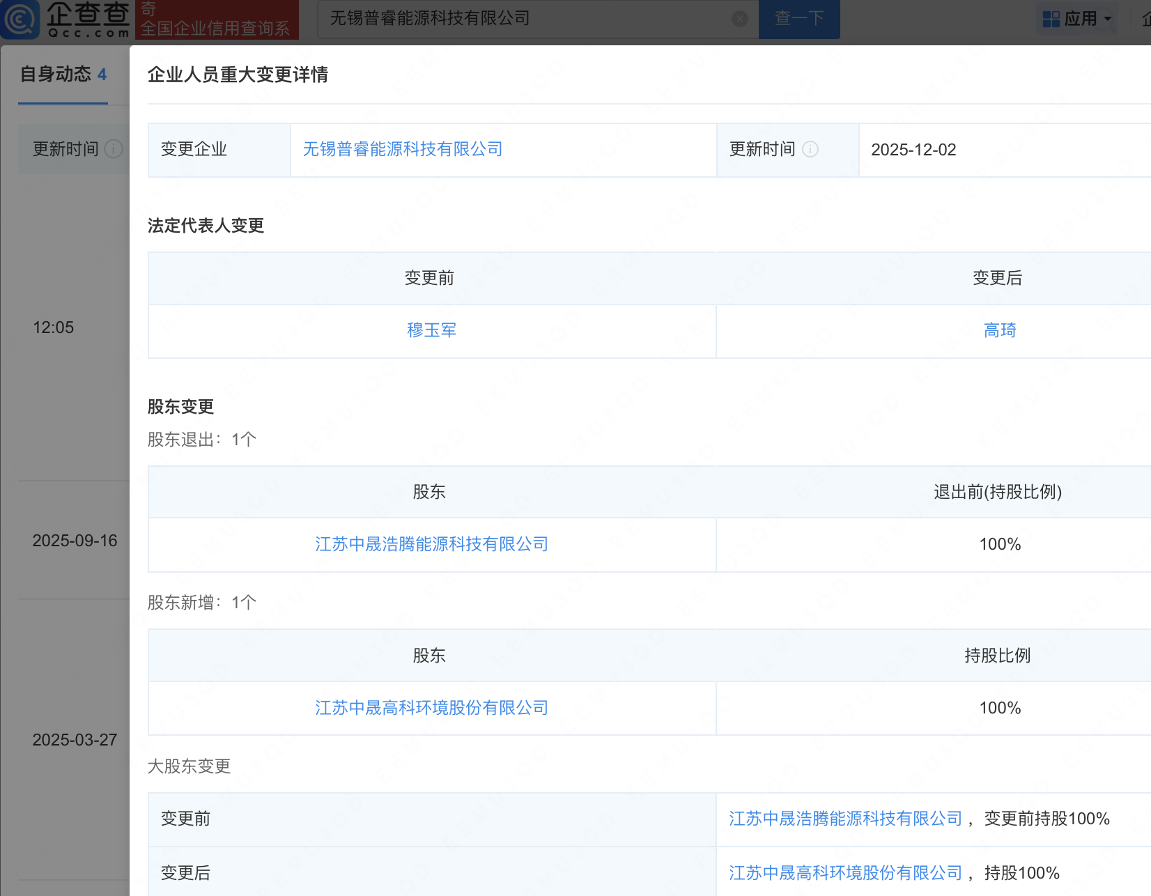 近日靠谱的前十大配资炒股公司,无锡普睿能源科技有限公司发生工商变更,江苏中晟浩腾能源科技有限公司退出股东行列,由中晟高科(002778)直接全资控股,同时法定代表人为由穆玉军变更为高琦。企查查信息显示,该公司成立于2024年,经营范围包含:新兴能源技术研发;光伏设备及元器件销售;风电场相关装备销售;新能源原动设备销售;储能技术服务等。